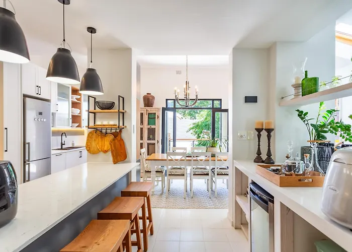 La Home For 8 In Central Green Point dispone de un hervidor eléctrico, una nevera y un horno para cocinar. Los huéspedes también pueden cenar en una zona de comedor. Los huéspedes pueden cenar en el restaurante Cushty Neighbourhood Deli, situado a tan solo 6 minutos a pie. El aeropuerto Internacional de la Ciudad del Cabo está a 25 km del establecimiento, y la parada de autobús St Bedes está a unos 100 metros.